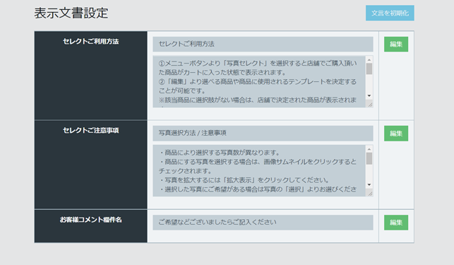 | お客様コメント欄件名 | お客様からご希望や連絡事項を記入する欄の名称を変更可能です。 セレクト完了前の画面に表示されます。 |
