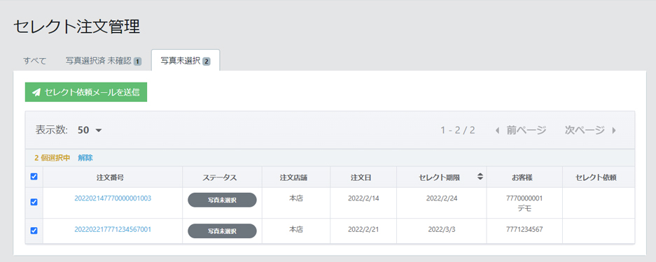 ②セレクトメニュー→注文管理→「写真未選択」のタブよりメールを送信したいお客様を選択します。