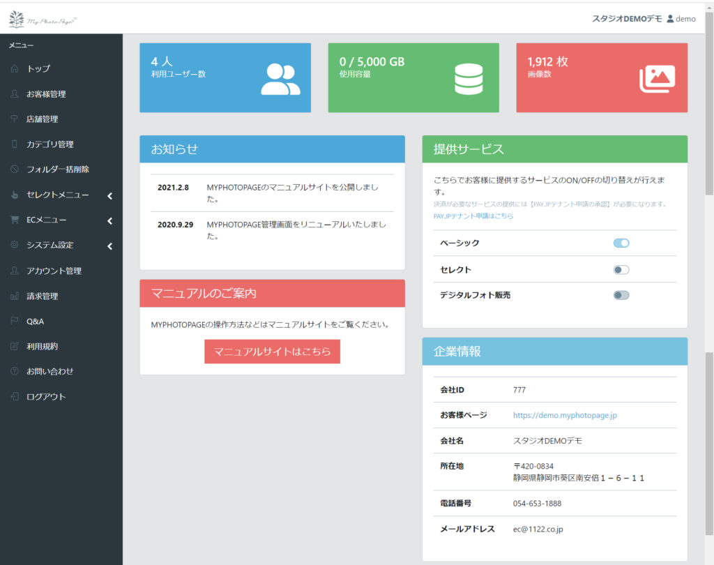 ※TOP画面に表示される「ユーザー数」「使用容量」「画像数」は毎日深夜1:00に再計算され表示される仕様です。