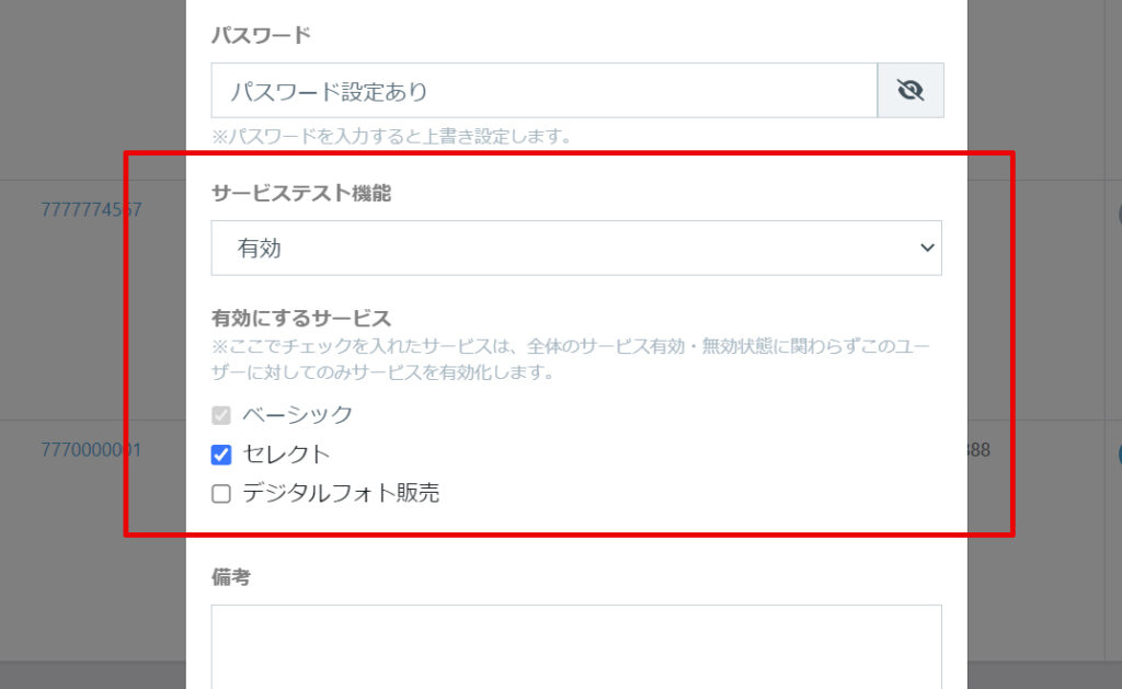 サービステスト機能で有効にしたいサービスをチェックすることでこのアカウント顧客のみが利用できるようになります。