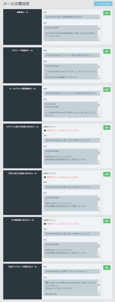 マイフォトページシステムから貴社の顧客へ送付するメールはすべてinfo@myphotopage.jpから送付されます。ここで設定するメールは顧客の顧客に送信する際にCCで貴社に送付する通知先アドレスです。
