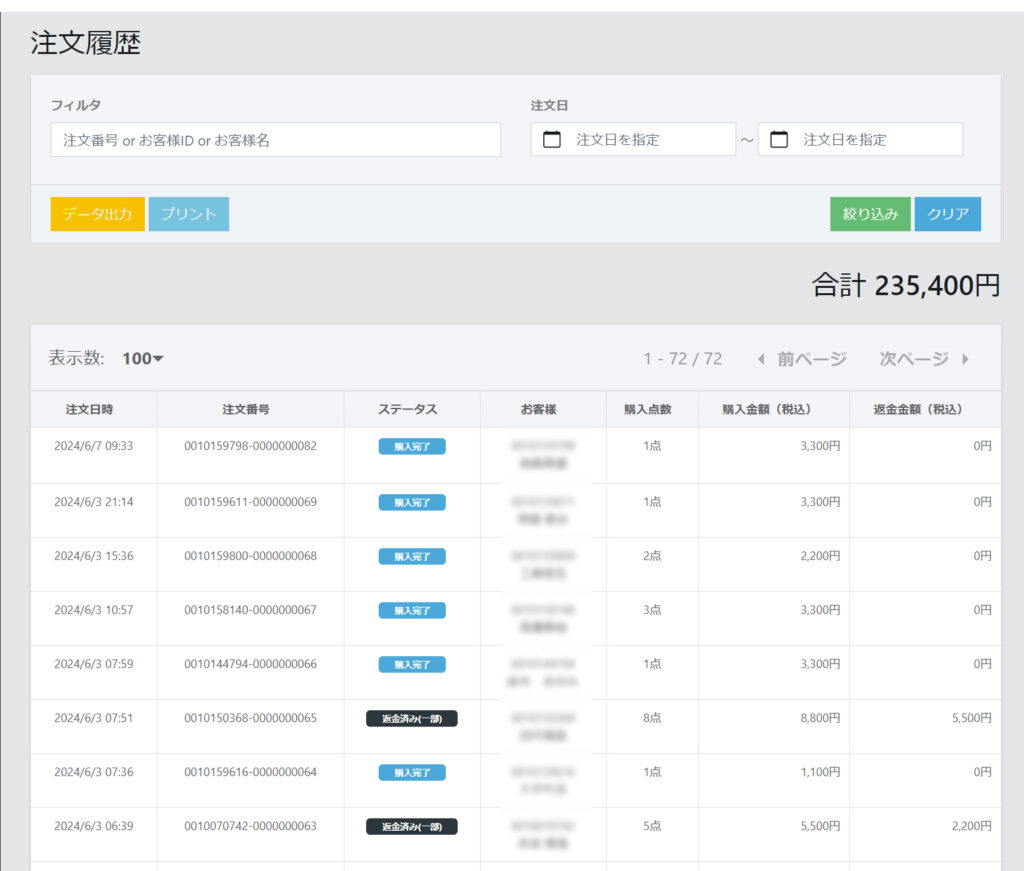 管理画面 ECメニュー 注文履歴