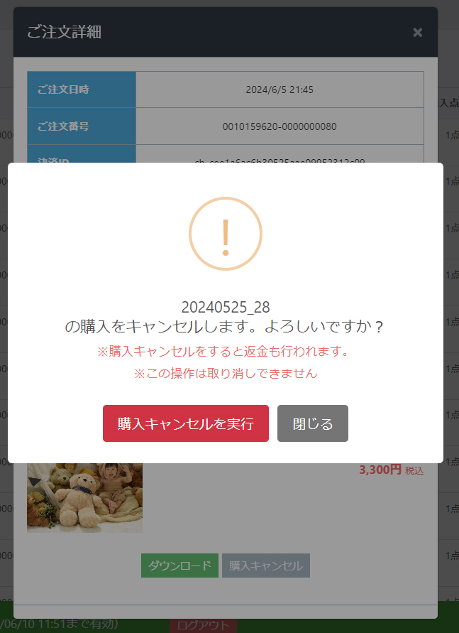 「購入キャンセル」で商品単位のキャンセル、返金が可能です。