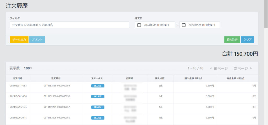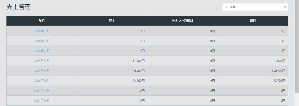各月毎の売上を確認できます。各月は注文履歴にリンクしています。