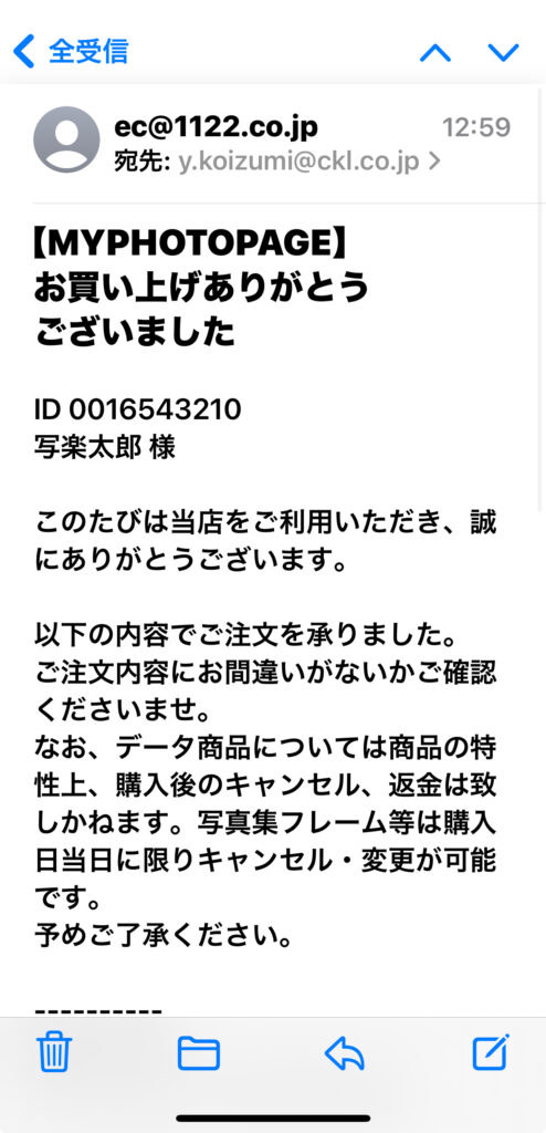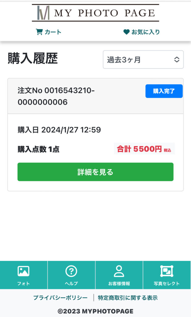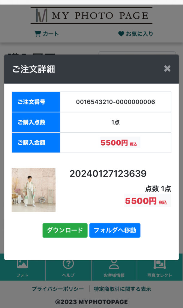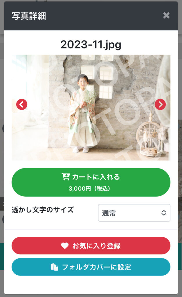 フォルダ内、写真一覧画面から該当のカットをクリックし、写真詳細を表示。