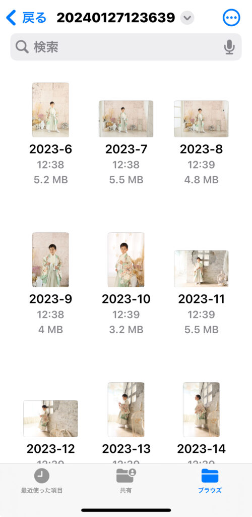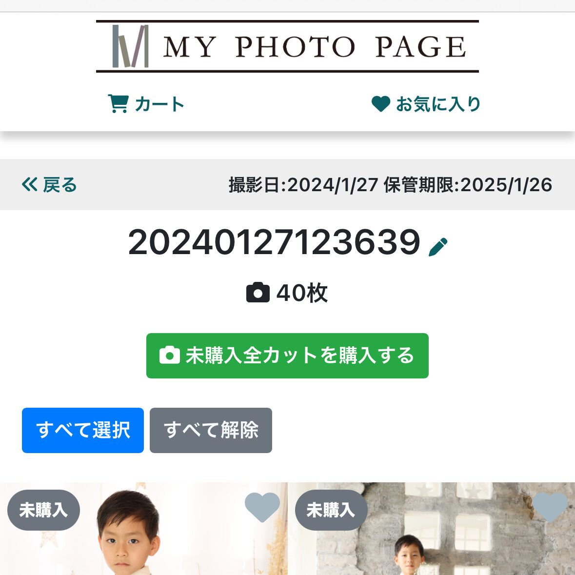 お客様画面、写真一覧から該当フォルダをクリックし、フォルダ内写真一覧を表示すると上部に