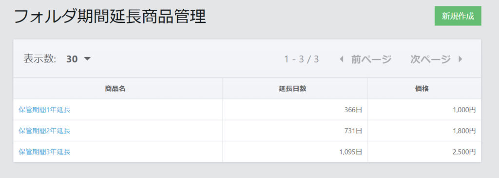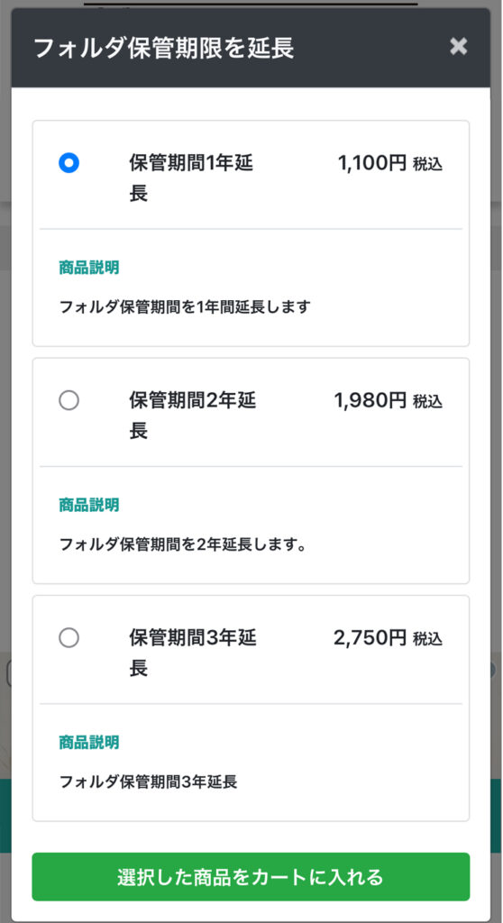 「フォルダ保管期限を延長」をクリックで保管期間延長商品が表示されます。