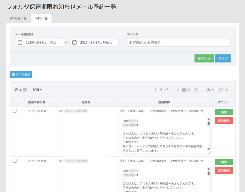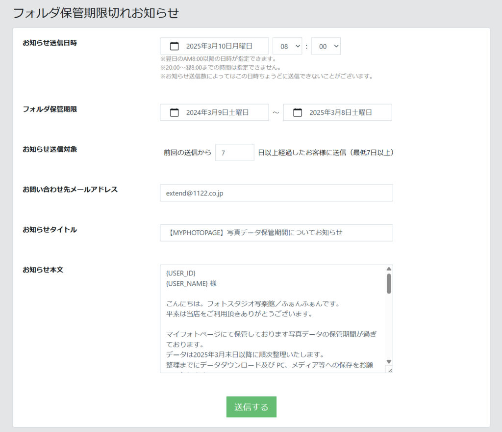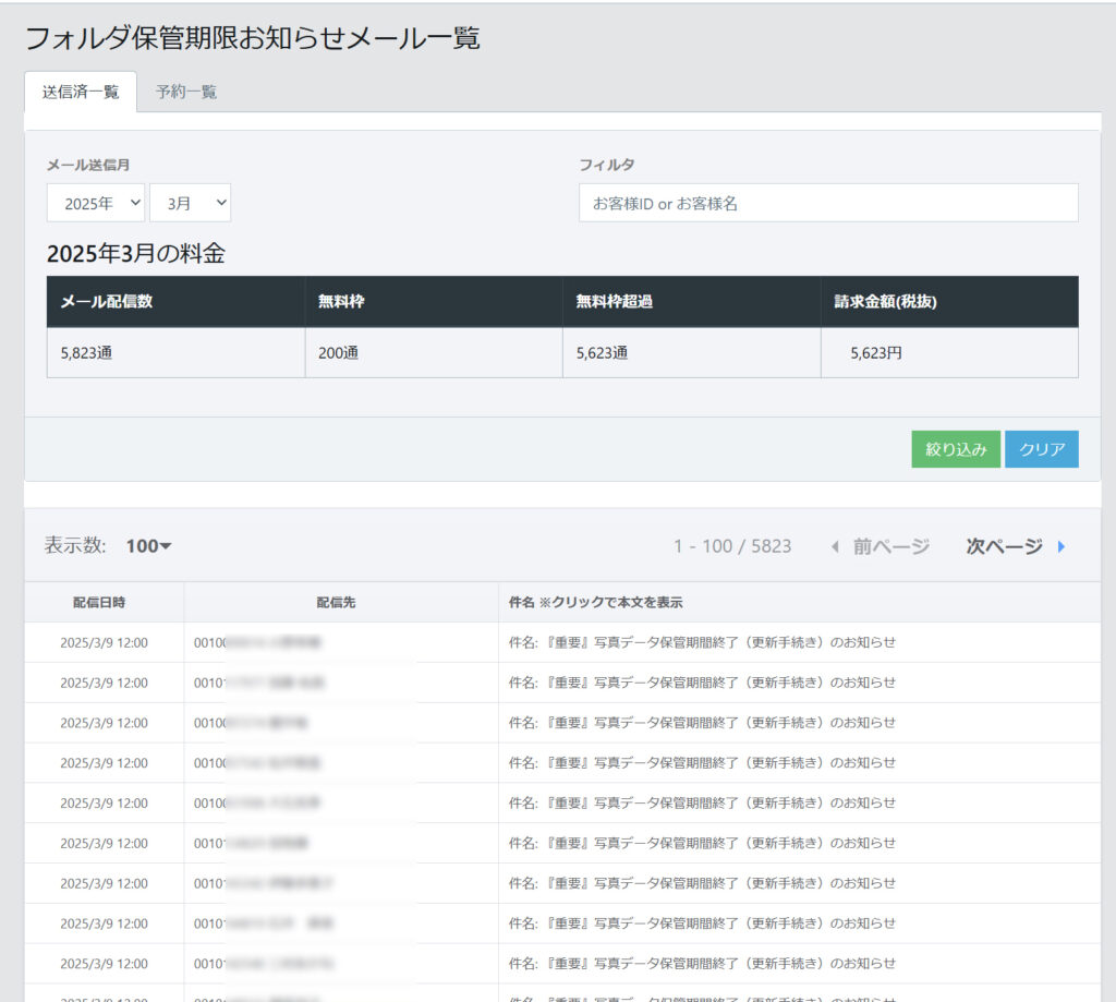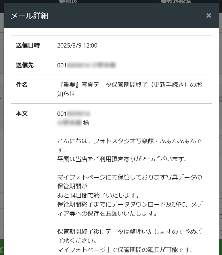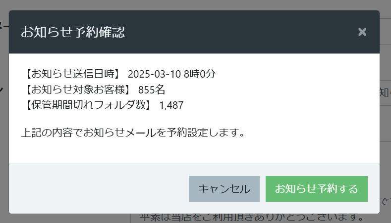 既に保管期限の切れている顧客へメールにて案内を行うことが可能です。