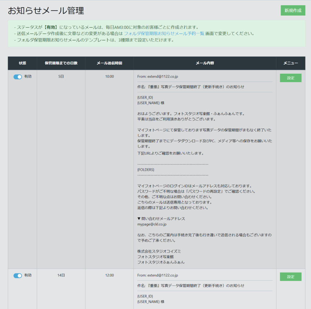 フォルダ保管期限お知らせメールのテンプレートは、3種類まで設定いただけます。