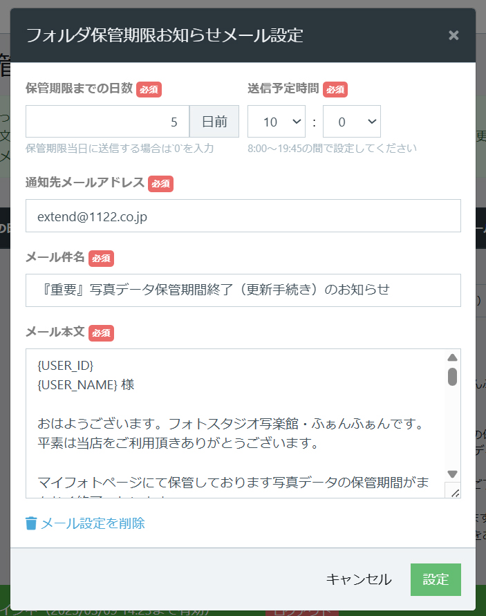 お客様画面、該当フォルダクリック後の写真一覧画面にフォルダ保管切れの案内バナーの表示設定が可能です。