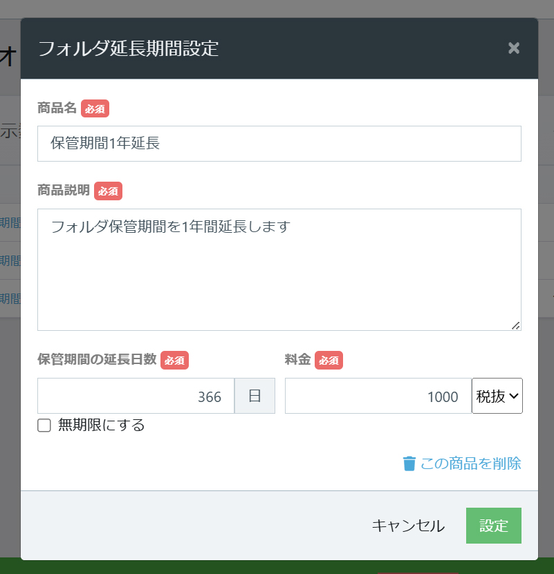 フォルダ期間延長商品の設定を行います。
